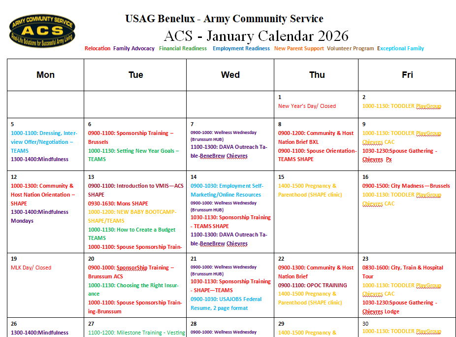 - Financial management before, during, and after deployment.For more information or to schedule training contact ACS